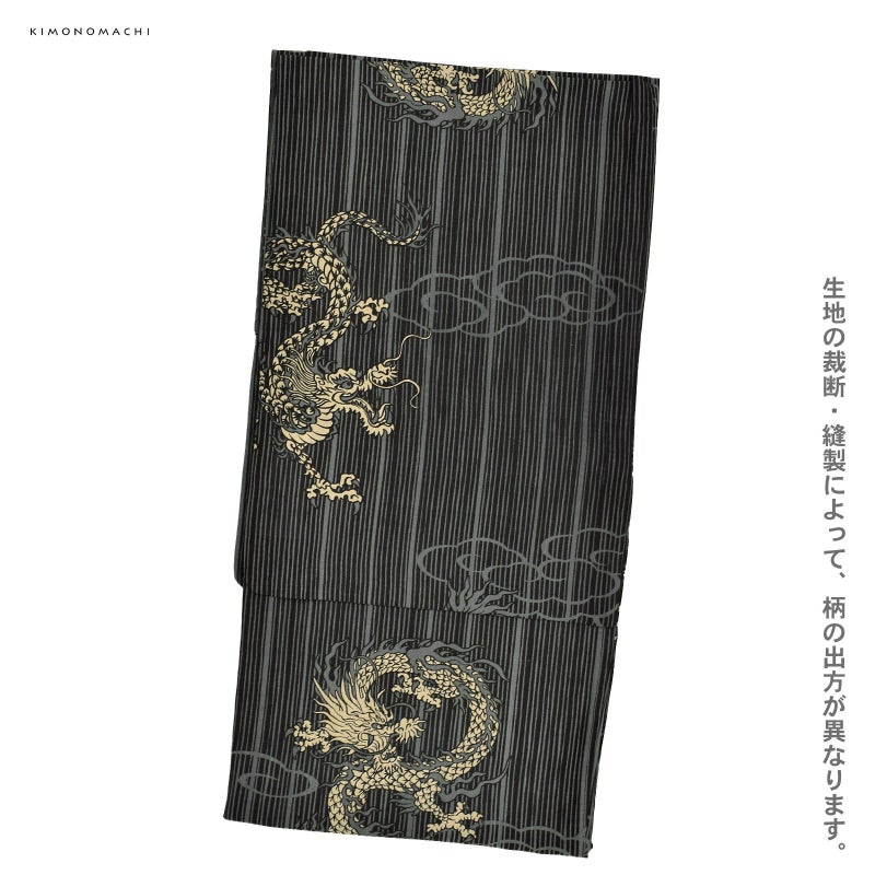 【色柄】やや暗めの灰色の地に黒の細い乱れ縞。その上に、地色と同系色の線で表現された雲に生成り色の体の龍。