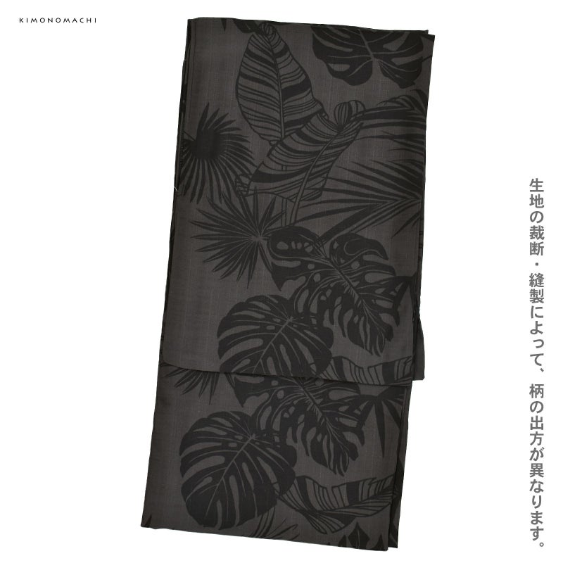 【色柄】チャコールグレーの地に、黒で全体に表現された椰子(ヤシ)や棕櫚(シュロ)、オーガスタ、モンステラなど南国植物の葉。