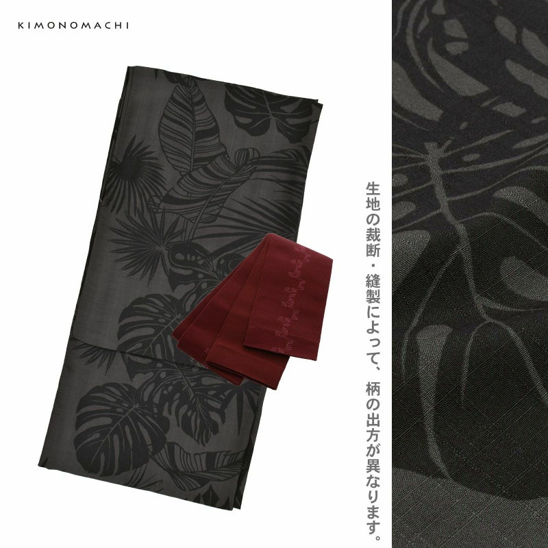 浴衣:チャコールグレーの地に、黒で全体に表現された椰子(ヤシ)や棕櫚(シュロ)、オーガスタ、モンステラなど南国植物の葉。