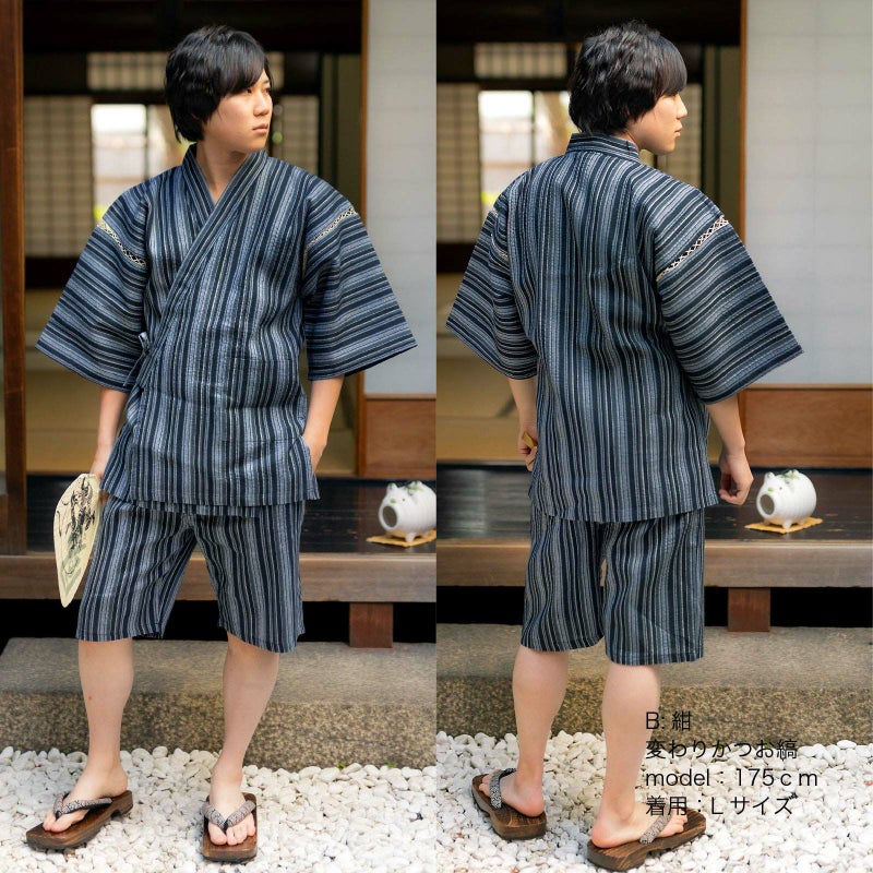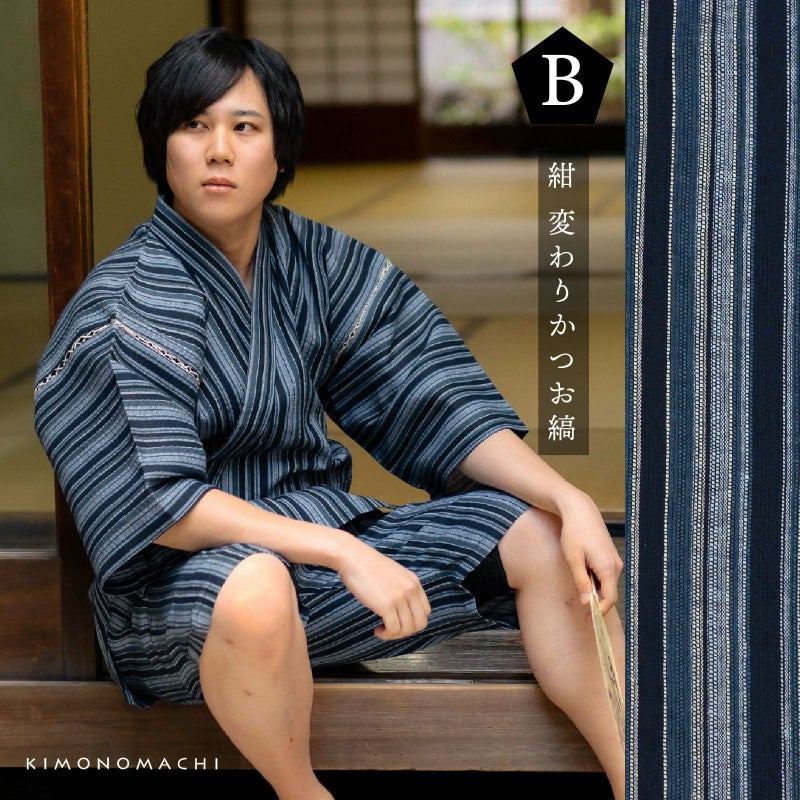 B紺 変わりかつお縞…濃紺、藍、薄水色に白のランダムな間隔のかつお縞。