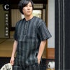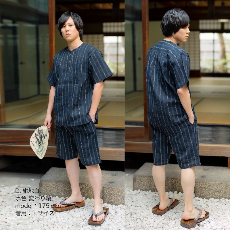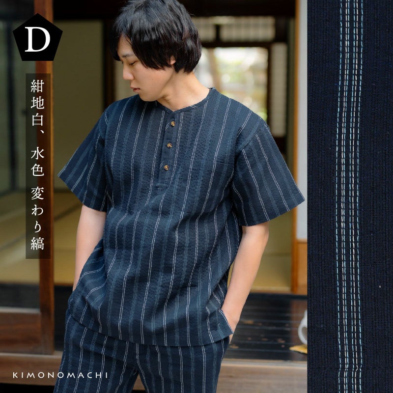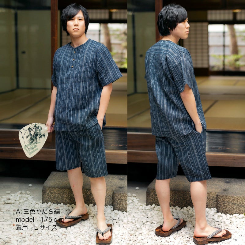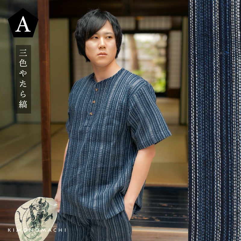 リサイクル糸を使用した綿ポリエステル素材のヘンリーネックしじら織り甚平です。