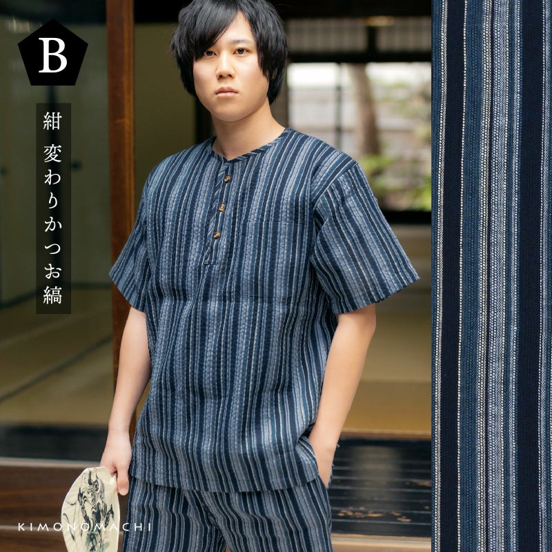 B紺 変わりかつお縞…濃紺、藍、薄水色に白のランダムな間隔のかつお縞。