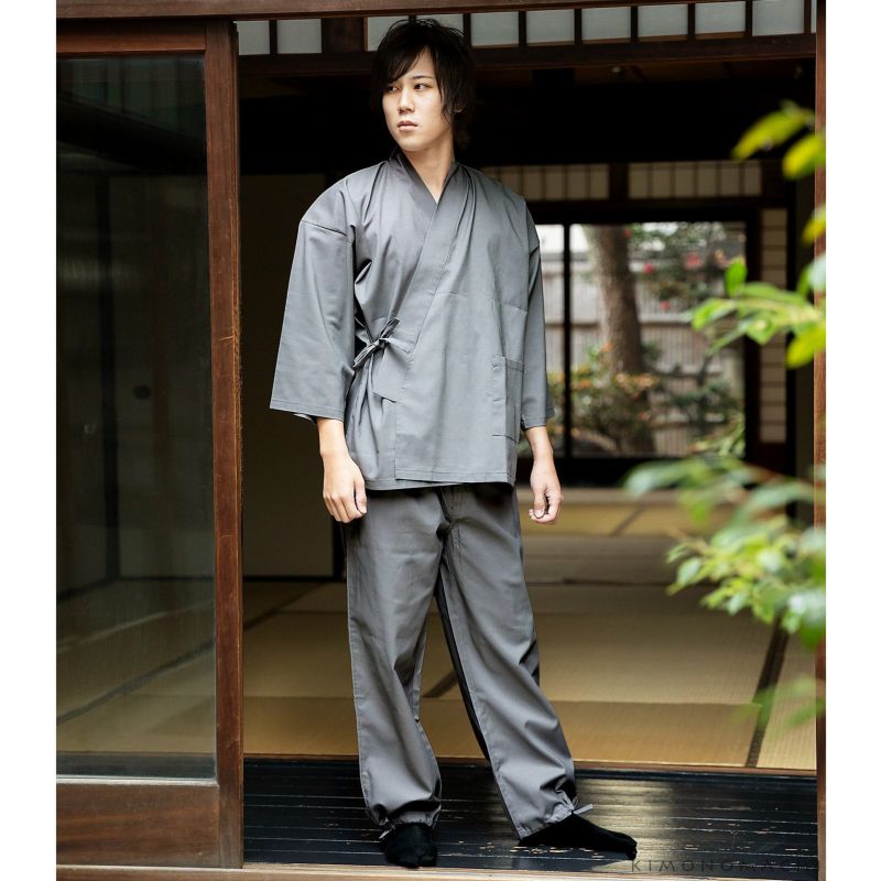 綿ポリ素材の作務衣です。上着、ズボンの上下に分かれています。
