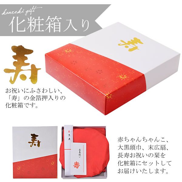 【商品内容】頭巾、ちゃんちゃんこ、末広(扇子)、栞、化粧箱の計5点
