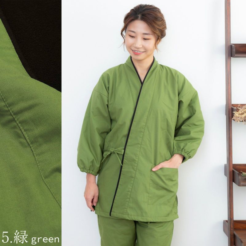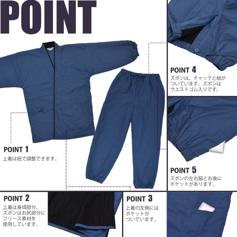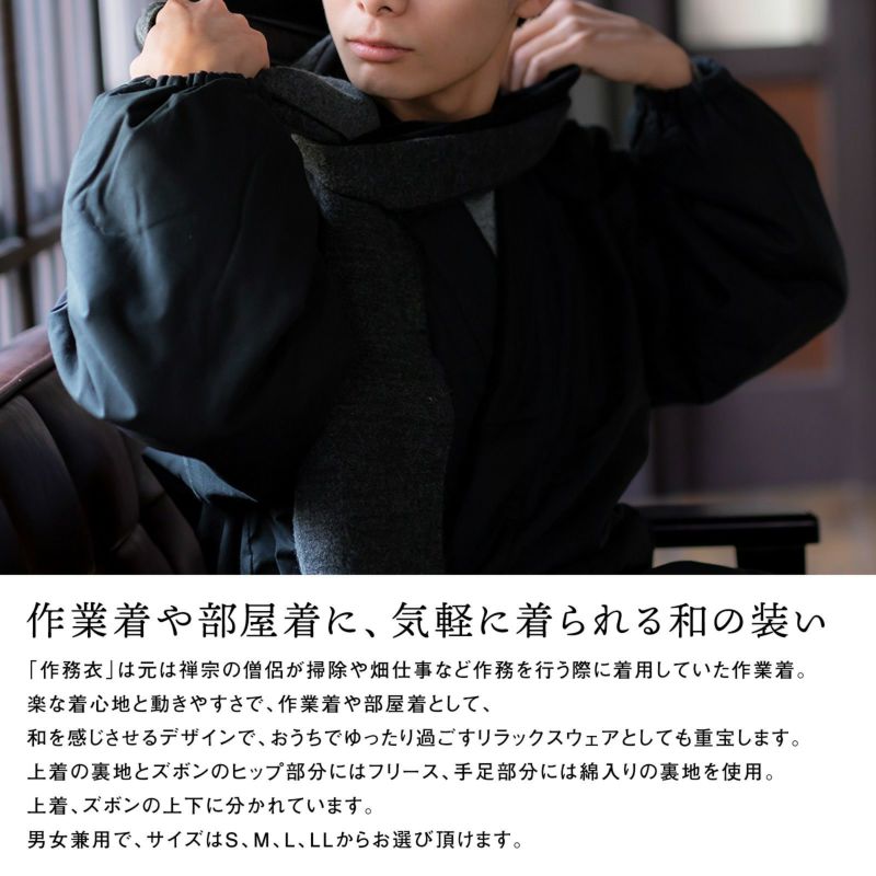 裏地フリースと中綿入りで暖かな男女兼用作務衣です。上着、ズボンの上下に分かれています。