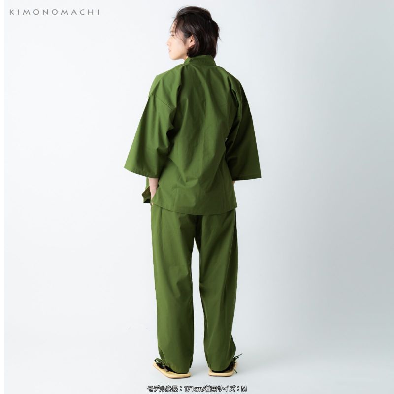綿ポリ素材の、通年で着ていただける作務衣です。上着、ズボンの上下に分かれています。