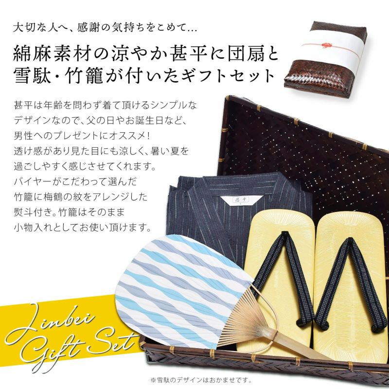 【商品内容】甚平1点(上着とズボンのセット)とうちわと雪駄(鼻緒柄おまかせ)のセット、竹籠入り・梅熨斗ラッピング付き