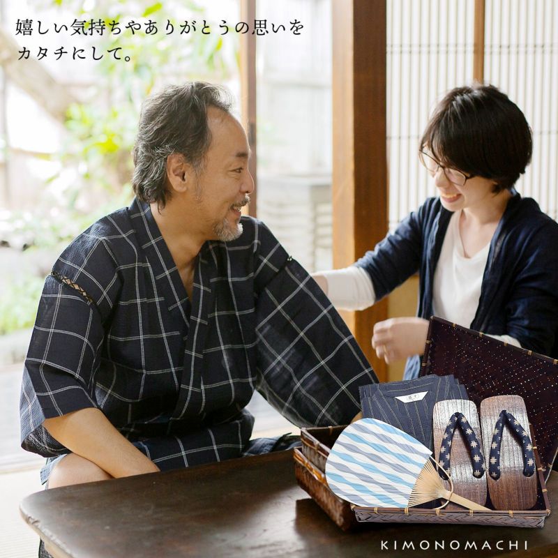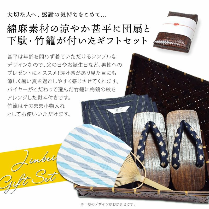 【商品内容】甚平1点(上着とズボンのセット)とうちわと下駄(鼻緒柄おまかせ)のセット、竹籠入り・梅熨斗ラッピング付き