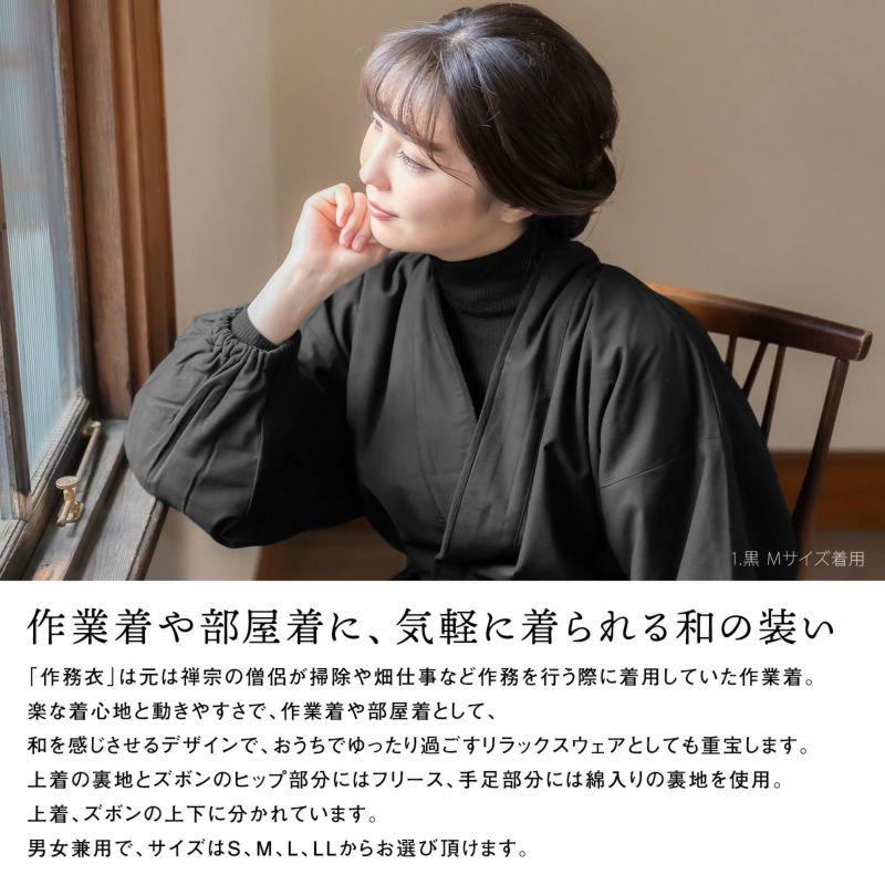 裏地フリースと中綿入りで暖かな男女兼用作務衣です。上着、ズボンの上下に分かれています。