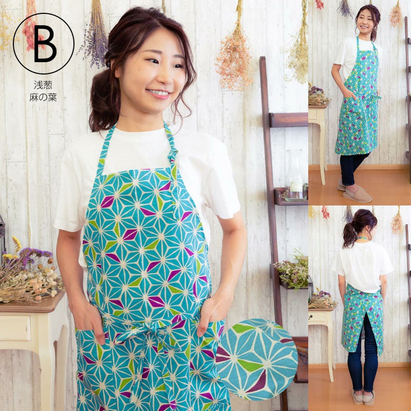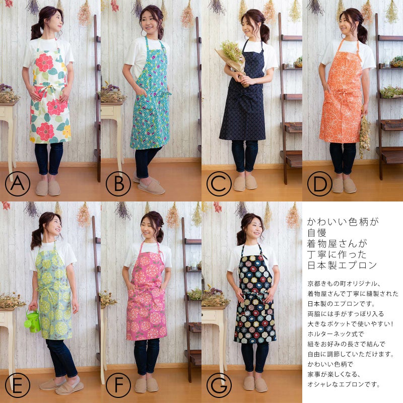 エプロン 「白色フラワー・浅葱麻の葉・濃紺七宝・オレンジピンクお花・グリーンブルーブーケ・ラズベリーブーケ・編み物風のお花 全7柄」 日本製 オシャレ かわいい KIMONOMACHI オリジナル カフェエプロン ホルターネック式 母の日 敬老の日 誕生日 プレゼント、ギフト、贈り物に最適 【送料無料】【メール便対応可】