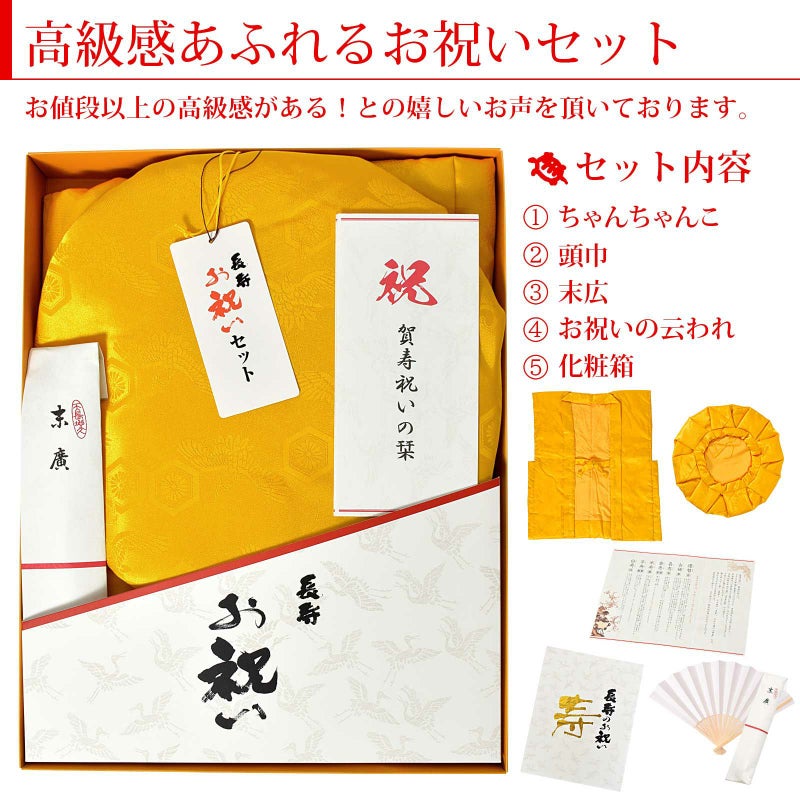 黄色のちゃんちゃんこ・頭巾・末広・お祝いするいわれが書かれた紙と、いたれりつくせりのセットでこの価格!かなりお得です。