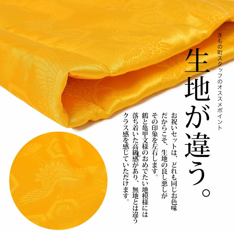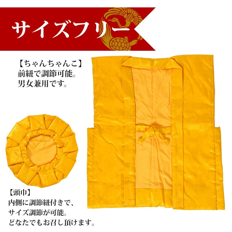 ・頭巾、ちゃんちゃんこ…山吹色みの黄色。地模様として鶴と菊入り亀甲文が入っています。