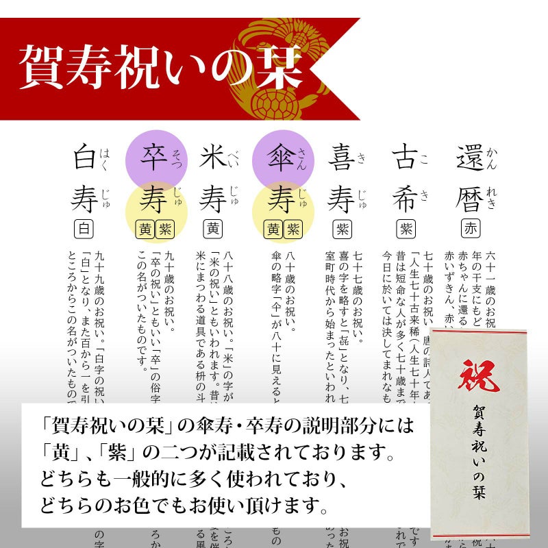 「長寿御祝いの栞」には、傘寿・卒寿の御祝いの説明部分に「紫」と記載されていますが、一般的に「黄」も多く使われており、どちらの色でも大丈夫です。