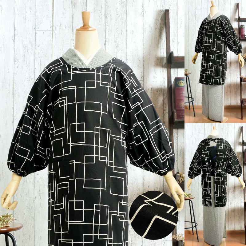 G黒地 スクエア…黒地に、白に近い生成り色のラインのランダムなスクエア柄。