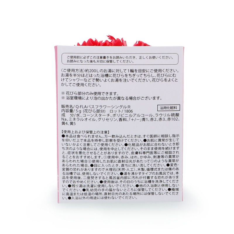 入浴剤としてお風呂のお湯100~200Lを想定して成分を配合しております。洗面台またはボウルなどでお試しいただく際は花びら1~2枚でお試しください。一輪すべてをいれますと濃度が高くなりますのでご注意ください。