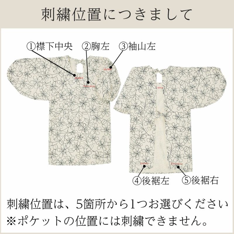 襟下中央、左胸、左袖、裾下左、裾下右の5カ所の中から1カ所お選びいただき、お名前の刺繍を入れていただけます。