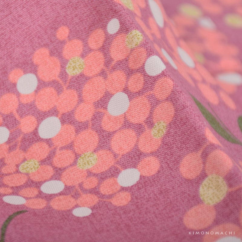 浅い赤紫色地に、オレンジピンクのブーケ模様。小花のような、実のような模様が可愛らしい雰囲気。
