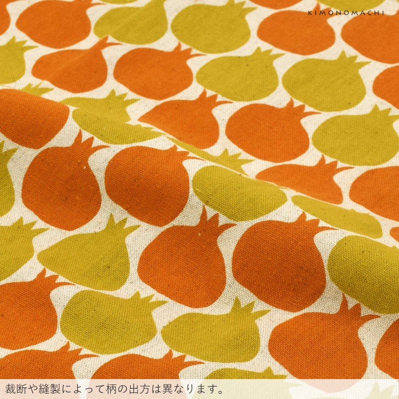 【カラー】生成色の地に、からし色、オレンジ色のザクロの実の柄。玉ねぎのようにも球根のようにも見えます。