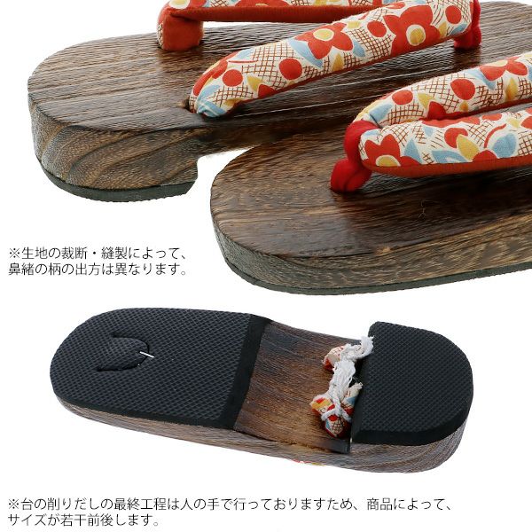 【カラー】鼻緒はオレンジ色のレトロなお花模様。台は焼桐の焦げ茶色。