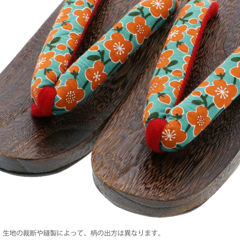 【カラー】鼻緒はターコイズ地にオレンジ色の梅。前坪は赤。台は焼桐の焦げ茶。