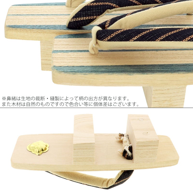 三味型の白木の台に、阿波の藍で染められた縦縞が涼やかな二枚歯の下駄です。