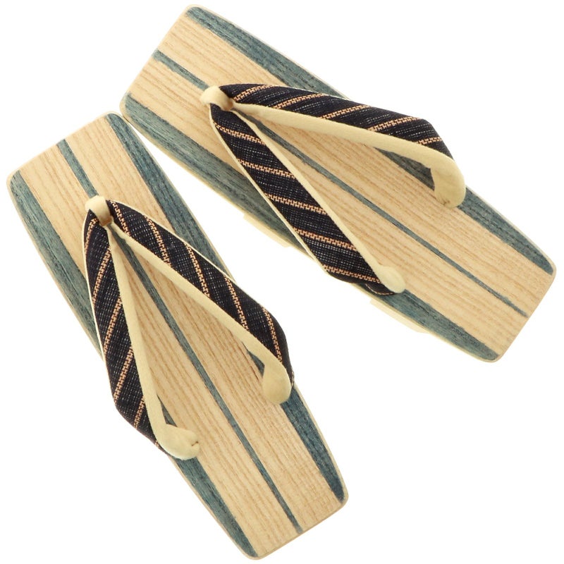 【カラー】深緑色の縦縞のナチュラルな木の色の台、黒地にベージュの細い斜めの縞の鼻緒。鼻緒の裏地は生成り色。