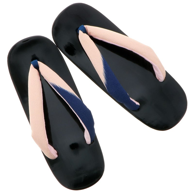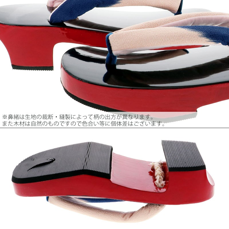 【カラー】鼻緒はごく淡いピンク色と紺の絣風、前坪も紺色。台の天は黒、側面は赤。