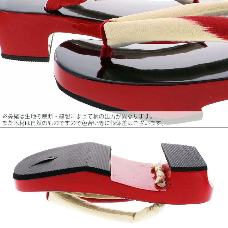 【カラー】鼻緒は光沢のある生成り色と赤の絣風、前坪も赤。台の天は黒、側面は赤。