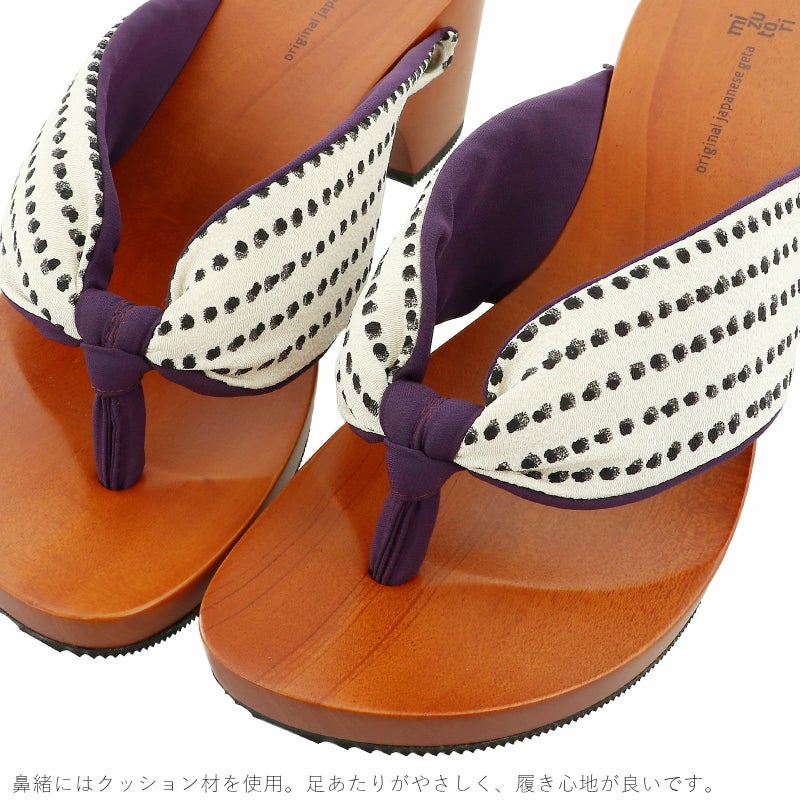 足形に添ったカーブのある、ヒールタイプの台。台の色は赤みのある自然な茶色。幅広の鼻緒は、白地に墨色のドット。裏地と前坪は深い紫。