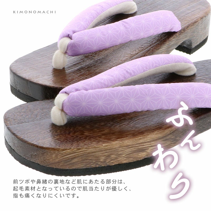 【色柄】鼻緒は薄紫の地に麻の葉模様、鼻をの裏は白。前坪は白。台は焼桐の焦げ茶色。