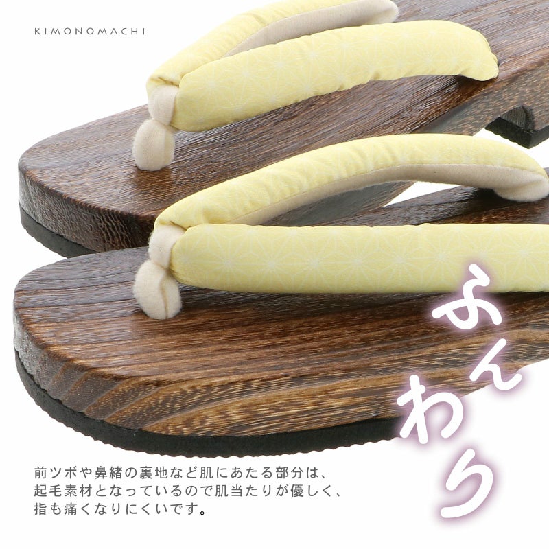 【色柄】鼻緒は薄黄色の地に麻の葉模様、鼻をの裏は白。前坪は白。台は焼桐の焦げ茶色。
