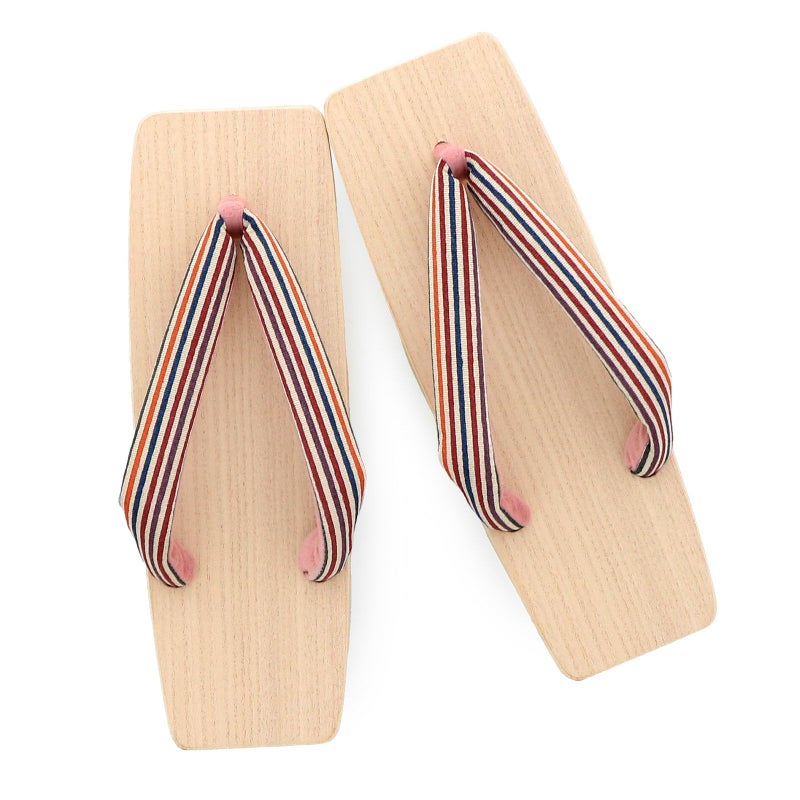 二枚歯下駄 単品「赤紫、オレンジ、青の縞の鼻緒、白木台」三味 女性下駄 日本製 レディース 桐下駄