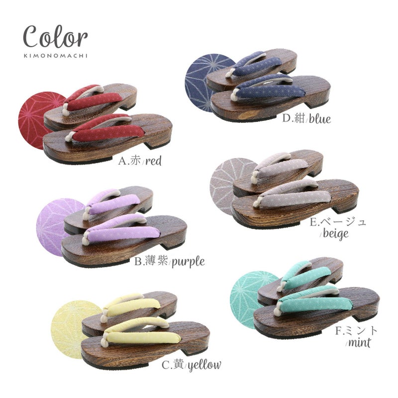 C.麻の葉 黄色:鼻緒は薄黄色の地に麻の葉模様、鼻をの裏は白。前坪は白。台は焼桐の焦げ茶色。