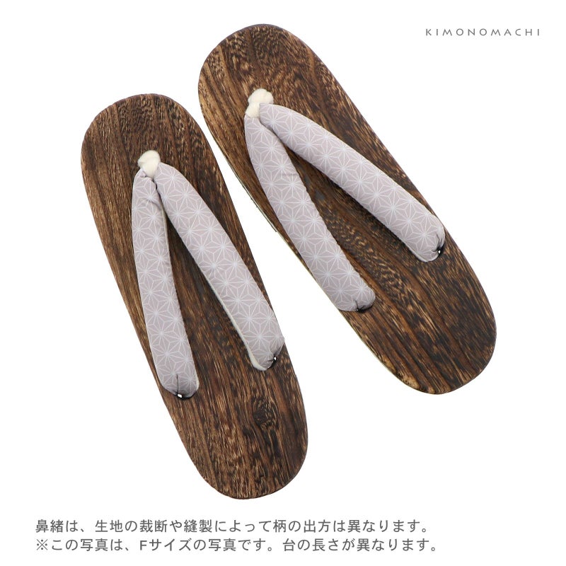 E.麻の葉 ベージュ:鼻緒はベージュの地に麻の葉模様、鼻をの裏は白。前坪は白。台は焼桐の焦げ茶色。