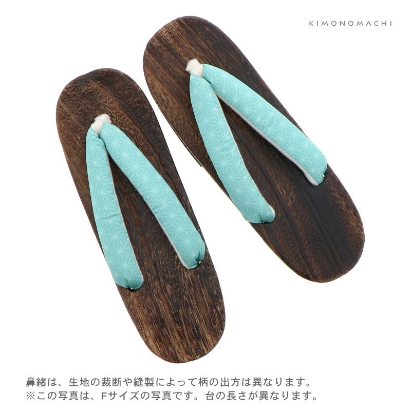 F.麻の葉 ミント:鼻緒は青緑地の地に麻の葉模様、鼻をの裏は白。前坪は白。台は焼桐の焦げ茶色。
