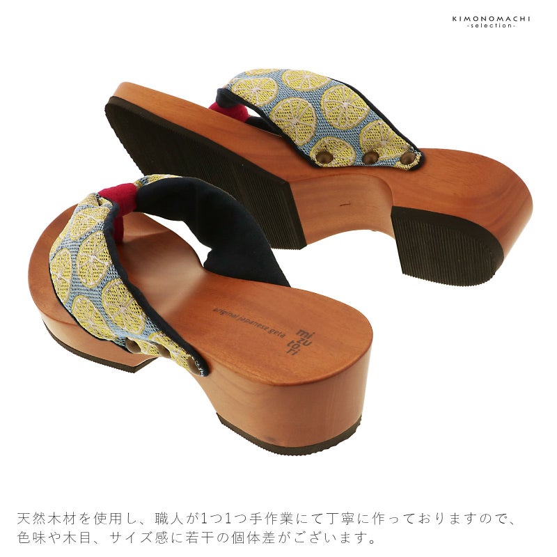 【色柄】足形に添ったカーブのあるヒールタイプの台。台の色は赤みのある自然な茶色。幅広の鼻緒は、織りで表現されたくすんだ水色に浅い黄色の輪切りレモンの柄。裏地は濃紺。前坪は赤。