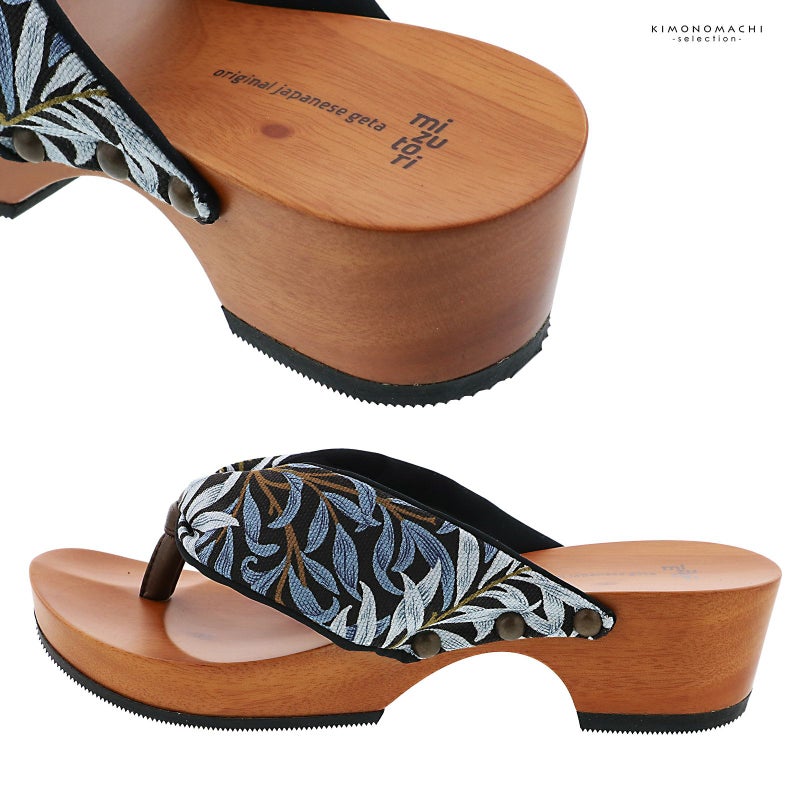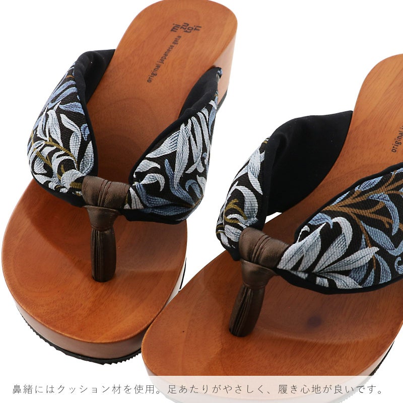 【色柄】足形に添ったカーブのあるヒールタイプの台。台の色は赤みのある自然な茶色。幅広の鼻緒は、黒地にグレイッシュなブルーとパウダーブルーのモリスの植物柄。裏地は黒。前坪はブロンズ。