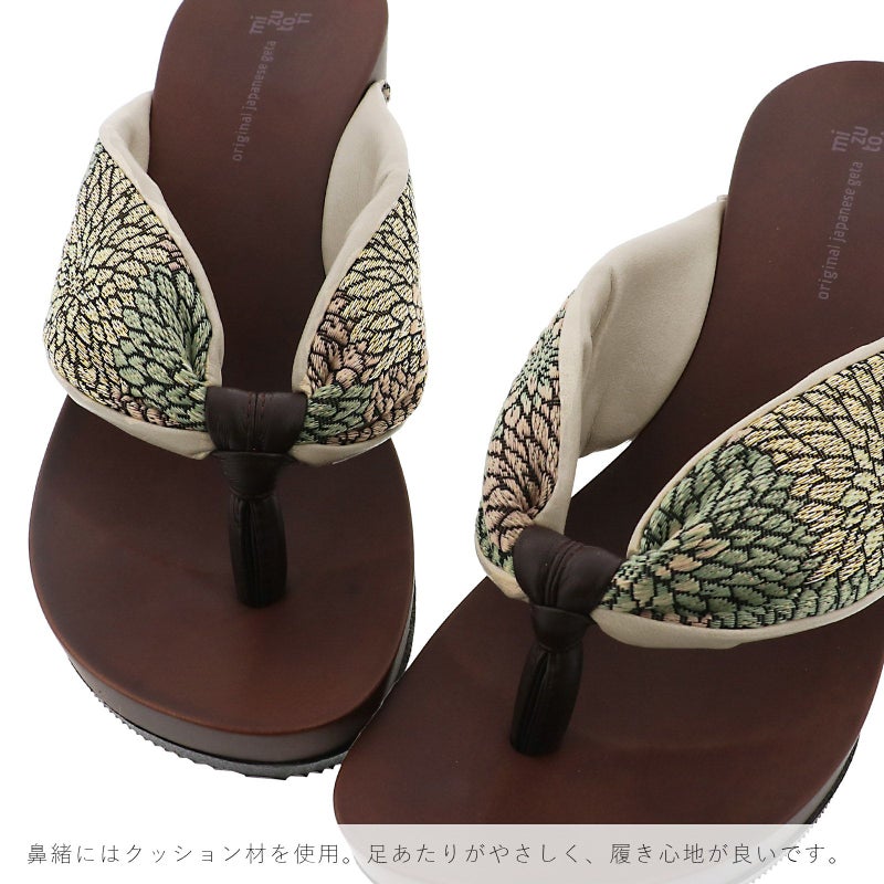 足裏にフィットするように施されたオリジナルの彫りと、クッション性のある鼻緒による履き心地の良さ。そして、現代のファッション、ライフスタイルにあう、豊富なデザインにより、従来の下駄の概念を覆し、進化した下駄を発信するブランド<mizutori>。