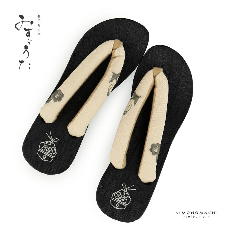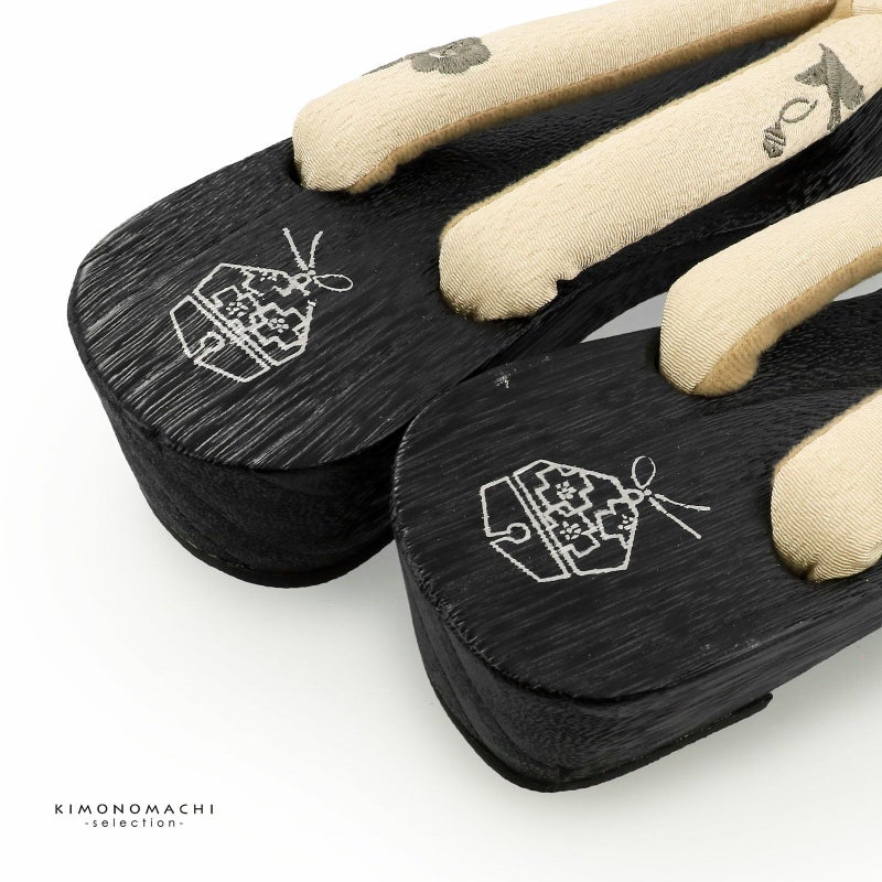 【色柄】足形に添ったカーブのあるヒールタイプの台。台の色は黒色、かかとに鈴の絵。鼻緒はベージュ地にグレーの小鳥と鈴、ツバキの花の刺繍。鼻緒の裏地と前坪はグレージュ。