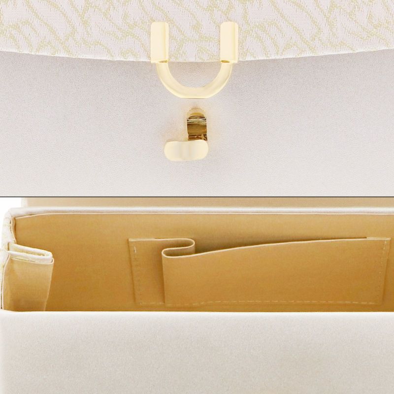 バッグの蓋と持ち手、草履の鼻緒と芯の巻きは、ごく淡い生成り色の地に金のマーブル模様。淡く虹色の光沢があり、上品な高級感。バッグの口金は金。バッグの受け、草履の台は、梨地のような細かな金の輝きのある淡いグレーベージュ。