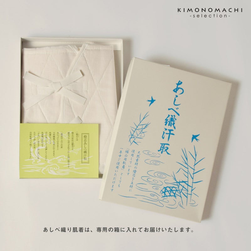 あしべ織汗取り肌着です。最高の素材を使用しており、吸汗性が高く、肌触りがいい、とても機能的な肌襦袢です。補正用肌着としてもご使用いただけます。