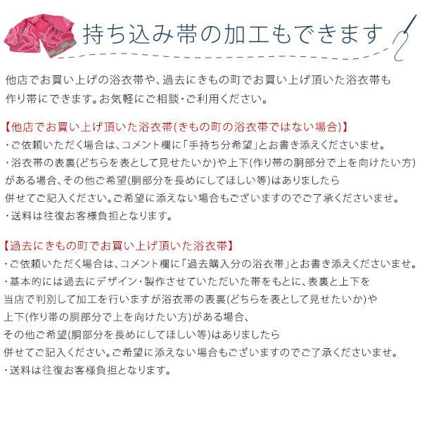 他店でお買い上げの浴衣帯や、過去にきもの町でお買い上げ頂いた浴衣帯も作り帯にできます。お気軽にご相談・ご利用ください。