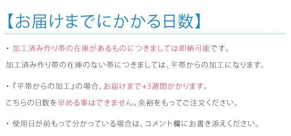 ・『平帯からの加工』の場合、お届けまでに+4週間かかり、お急ぎでありましても日数を早める事は出来ません。ご使用日を確認いただき、余裕をもってご注文ください。