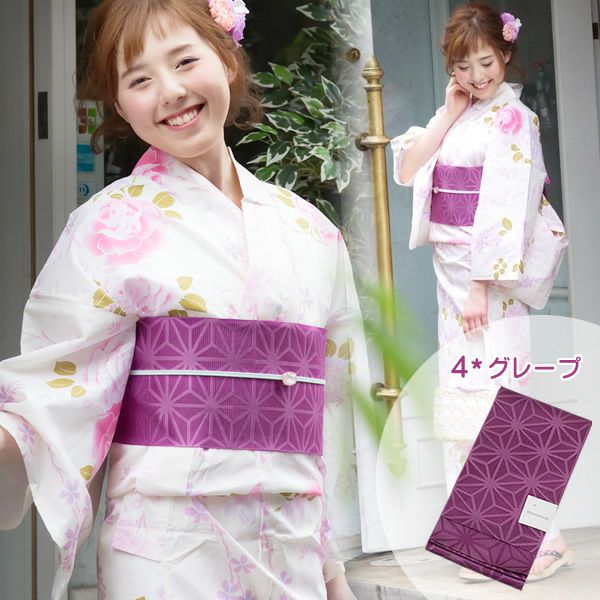 4:グレープ(葡萄色 紫色 パープル)…やや赤紫色寄りの葡萄色、グレープの帯です。大人向けの、落ち着いた色合いなので古典柄や粋な雰囲気に合います。