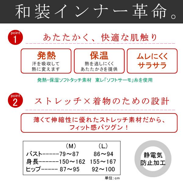舞妓さんたちの声から生まれた、着物のための肌着です。静電気防止加工も施されているので、冬のパチパチする静電気の不快感を解消してくれます。まさに、冬に最適!!な和装インナーです。
