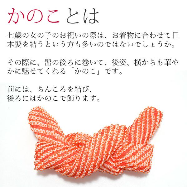 七歳の女の子のお祝いの際は、振袖に合わせて日本髪を結うという方も多いのではないでしょうか。その際に、髷の後ろに巻いて、後姿、横からも華やかに魅せてくれる「かのこ」です。前には、ちんころを結び、後ろにはかのこを♪