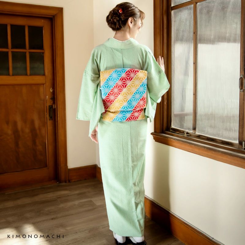 帯:斜めに並んだ朱色・山吹色・空色の3色ラインと、可愛らしい鹿の子模様の麻の葉の組み合せ。3色の切り替え部分や全体に施されている鹿の子模様の風合いが、柔らかさと温かみをプラスしています。