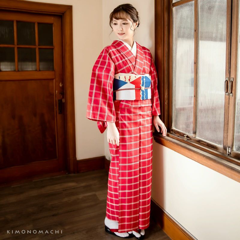 着物:鮮やかすぎないきれいな赤地に白の格子縞。かわいらしさの中にどこか懐かしい雰囲気。