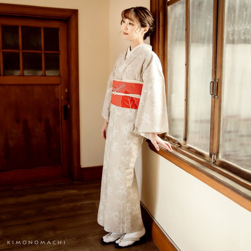 着物:ベージュ地に花模様のジャガード織りが大人っぽい雰囲気。ナチュラルで優しいデザインです。