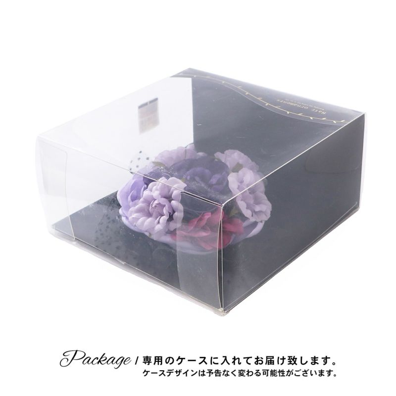 【カラー】淡い青藤色の大きなお花に、暗い濃い青紫色の大きめのお花、淡い青藤色、赤紫色の小さめのお花。黒色の水玉レースがエレガントな華やかさをプラスしてくれます。